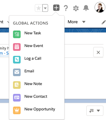 Click on the plus sign at the top of your screen and you can create new activities and records for any account, no matter where you are within Salesforce.