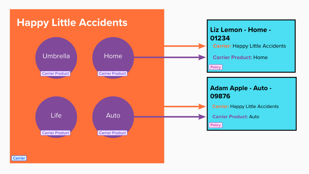 Happy Little Accidents is an insurance carrier that offers umbrella, home, life, and auto products. If that carrier is deleted, its products will be automatically deleted as well. While policies won’t be automatically deleted, they’ll have to select a new carrier and carrier product before Happy Little Accidents can be removed from the org.