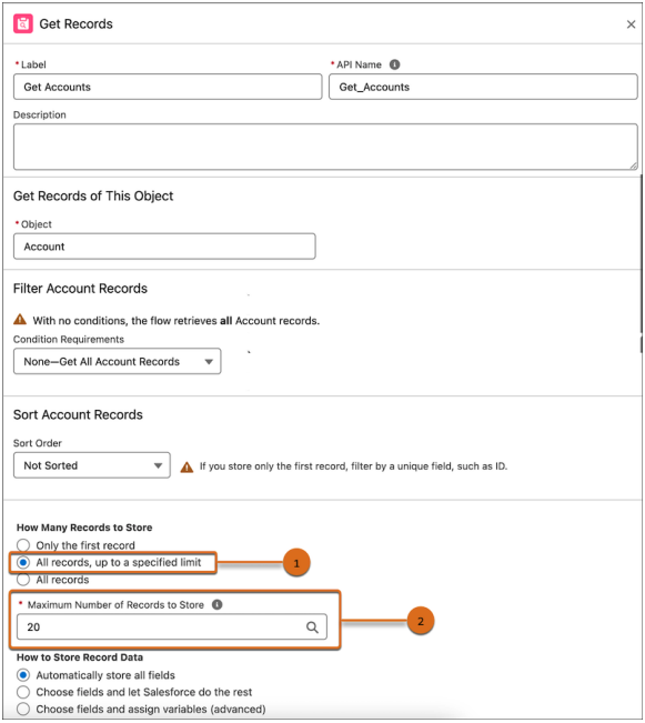 Working with large datasets can sometimes cause performance issues or hit governor limits when using the Get Records element set to retrieve all records. Salesforce has added the option to set an upper limit to the number of records retrieved. This can improve flow performance and reduce the risk of timeouts and errors.