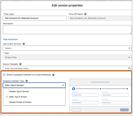 Flows created after the Spring ‘25 release will have this feature enabled by default. To turn it on in a screen flow created prior to this release, edit the version properties and show advanced. Check “Show a progress indicator on screen elements” and choose an indicator type. The options include a simple style (as shown above) or a path style. The path style can only be displayed at the top of the screen.