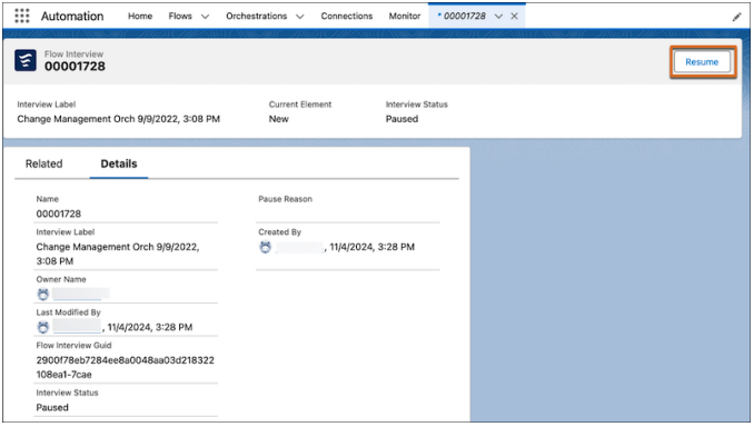 Similarly, to resume a paused flow, click on the Resume button in the top right corner of the record page.