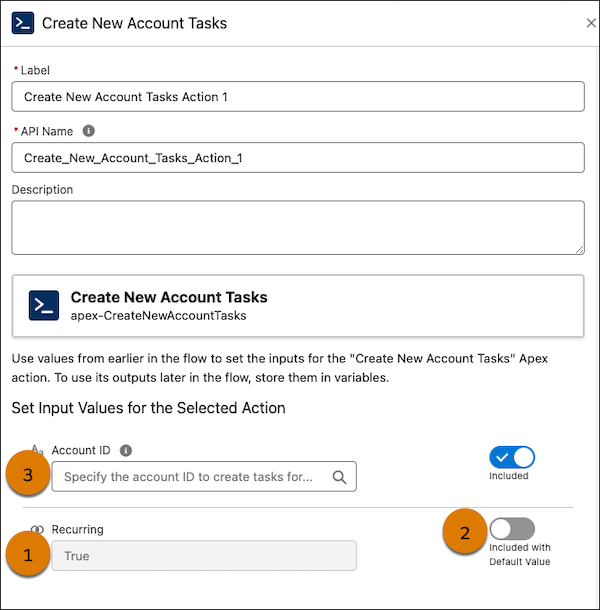 Actions with explicitly defined default values or custom placeholder text will be visible in action elements in flow builder. For each flow action input, admins can toggle between Included with Default Value to use the default value already defined in the action or Included with Specified Value to set a different one.