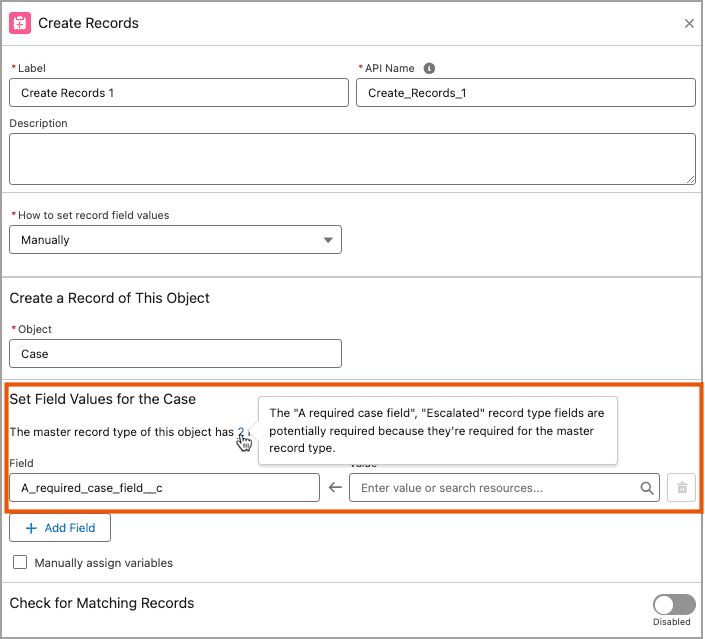 When setting field values on a Create Records element, flow builder will automatically show fields that are required for that object. With the required fields displayed in flow builder, admins won’t have to reference the object manager separately to determine which fields need to be included to prevent downstream issues.