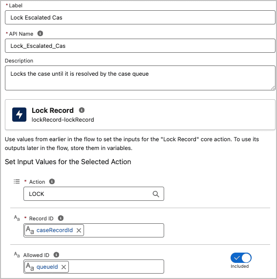 Lock and Unlock Record actions are now available for use in flows. You can use these actions in a flow to prevent records from being edited except for a user, group, or queue specified in the “Allowed ID” input.