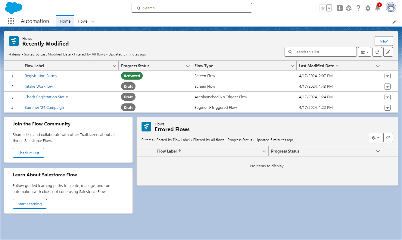 Flows will still be accessible from Setup, but the new Automation app gives users several helpful features such as the ability to search for flows using keywords in the flow label, list views for recently modified flows or flows with errors, and the ability to filter or sort flows by type, progress status, last modified date, last modifying user, or other associated record fields.