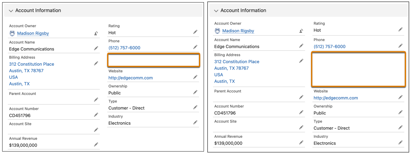 Admins can better customize vertical field alignment in lightning pages that use dynamic forms by adding blank spaces between fields. This Blank Space component is considered a field and counts against the limit of 100 fields per region. Users can further enhance alignment of fields in a section by using the “Align fields horizontally” field section property.