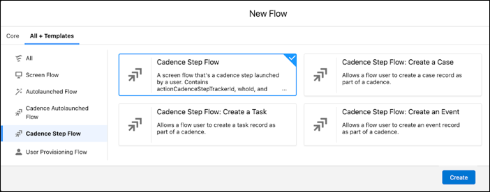 This feature also includes three Cadence Flow Step templates – Create a Task, Create a Case, and Create an Event.