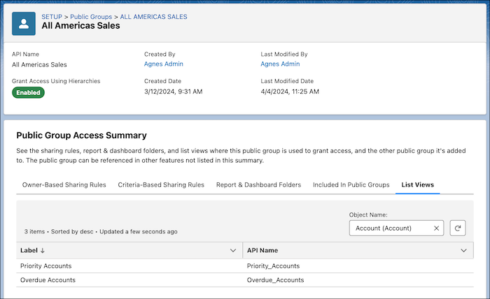 Ever wish you had a “Where is this used?” button on public groups? The Public Group Access Summary allows admins to more easily see where a public group is used and the level of access its members have. From the interface, admins can review which sharing rules reference the public group, as well as the report & dashboard folders and list views that are shared with them. If a public group is nested within another public group, admin can also see that from the “Included in Public Groups” tab.