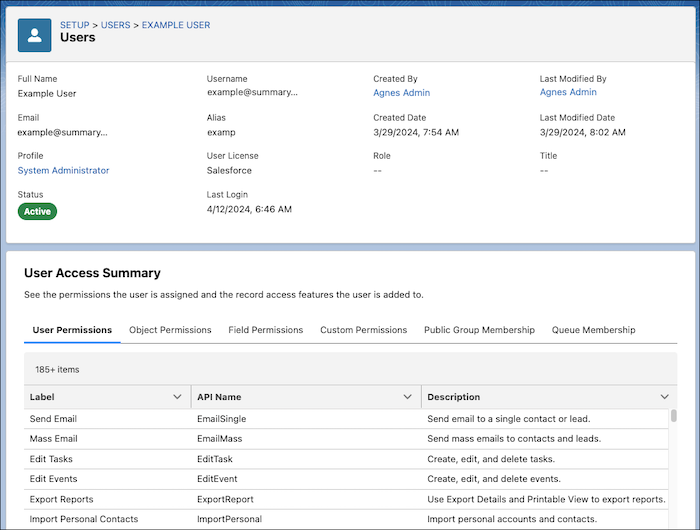 Summer ‘24 introduces a new view to help admins better track which permissions are available to a user. Rather than looking through each permission set, profile, public group, or queue individually, admins can use the User Access Summary on a user’s detail page to see their user, object, field, and custom permissions as well as public group and queue membership – all in one place!