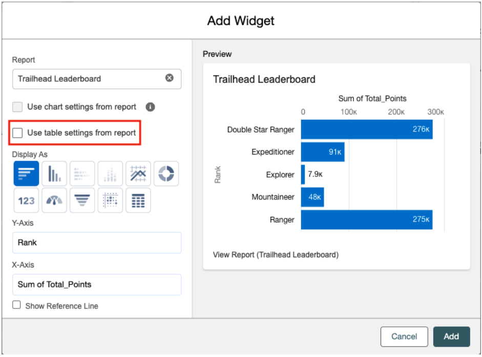 • Then, when adding a Lightning table to the dashboard, select the Use table setting from report (Beta) option.
