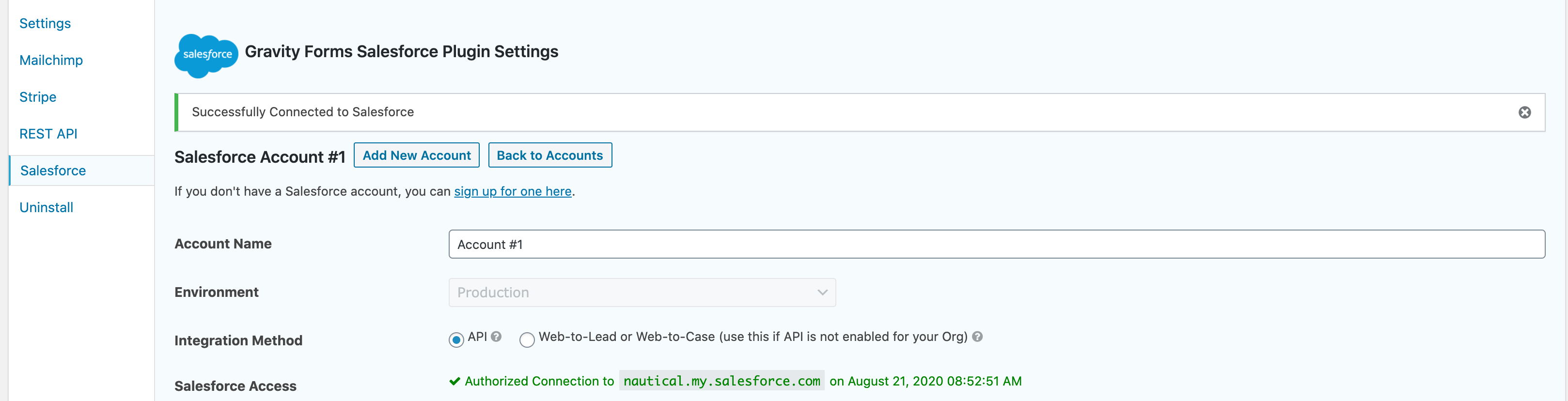 Once you’re all set with Gravity Forms, you’ll need to connect your Salesforce account! Under forms, go to the “Salesforce” tab. Name your account, choose which environment you want to use, and then the type of Integration Method (API or Web-to-Lead if API is not enabled). Then, connect to your Salesforce org by signing in under Salesforce Access.