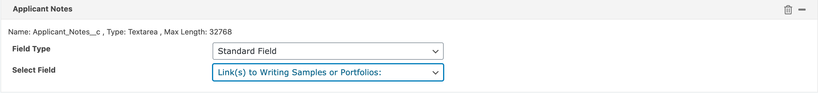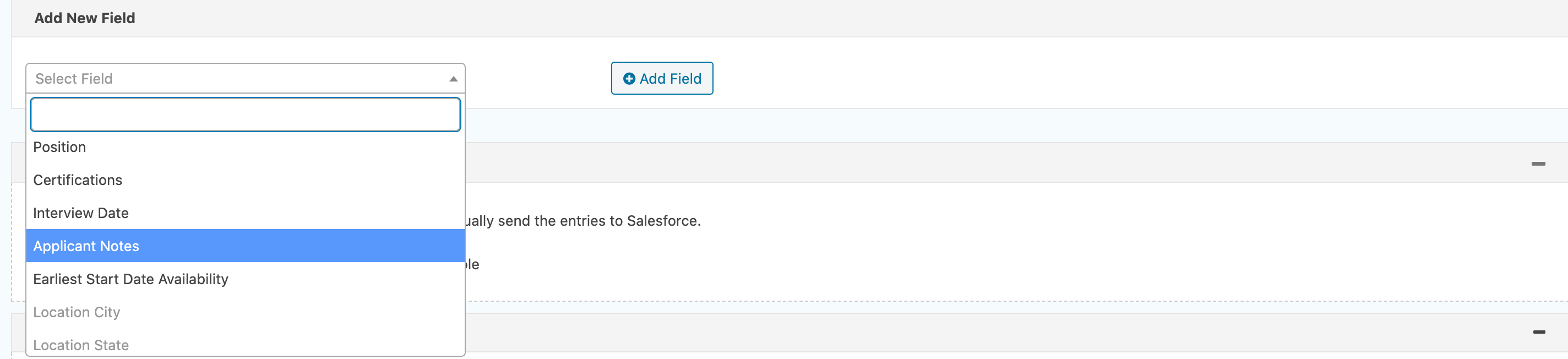Now it will give you the option to select which form field you want to map to that Salesforce field. Here we are mapping “Links to Writing Samples or Portfolios” on the form to the Applicant_Notes field in Salesforce.