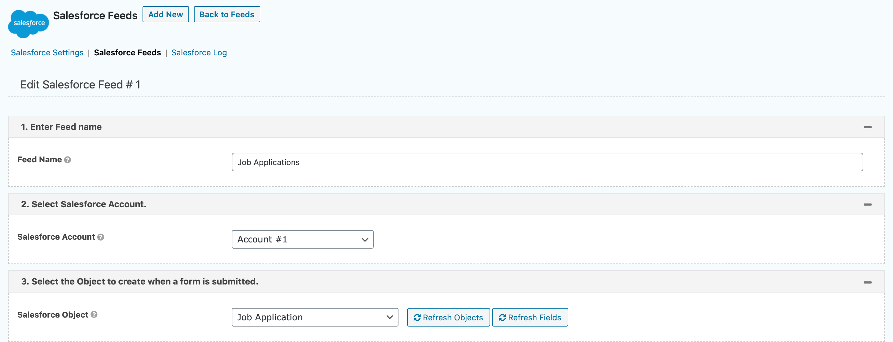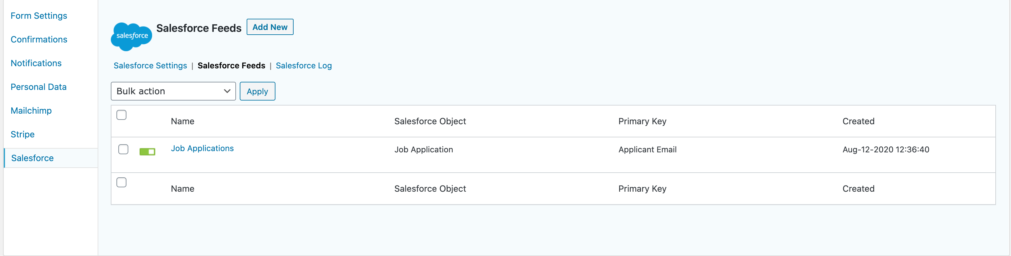Go to the settings of the form you’ve created, and then choose “Salesforce.” Hit “Add New” to create a new feed. We’ve already created a feed for job applications.