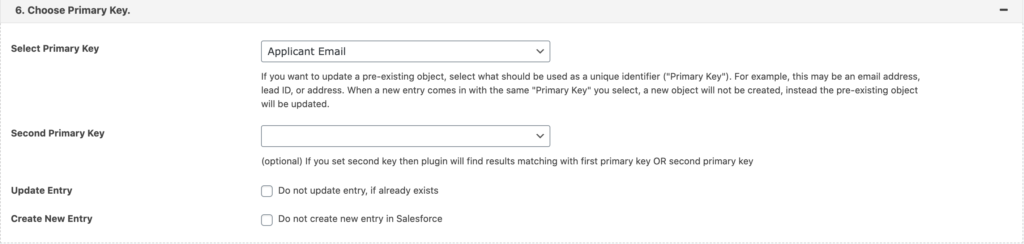 Once you have all your fields set up, you need to choose a primary key which will be used if you update a pre-existing object. We used “email,” but you could also use lead ID, or an address. Something specific and unique. You can also set a Second Primary Key.