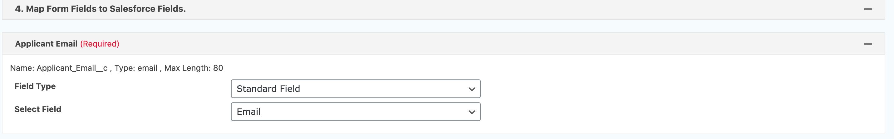 Any required fields will automatically show up for you to map. Majority of the time the field type will be “Standard Field.” You’ll select the form field that will match up with the Salesforce field. For us, we will be mapping the “Email” field to “Applicant_Email.” Pretty easy.