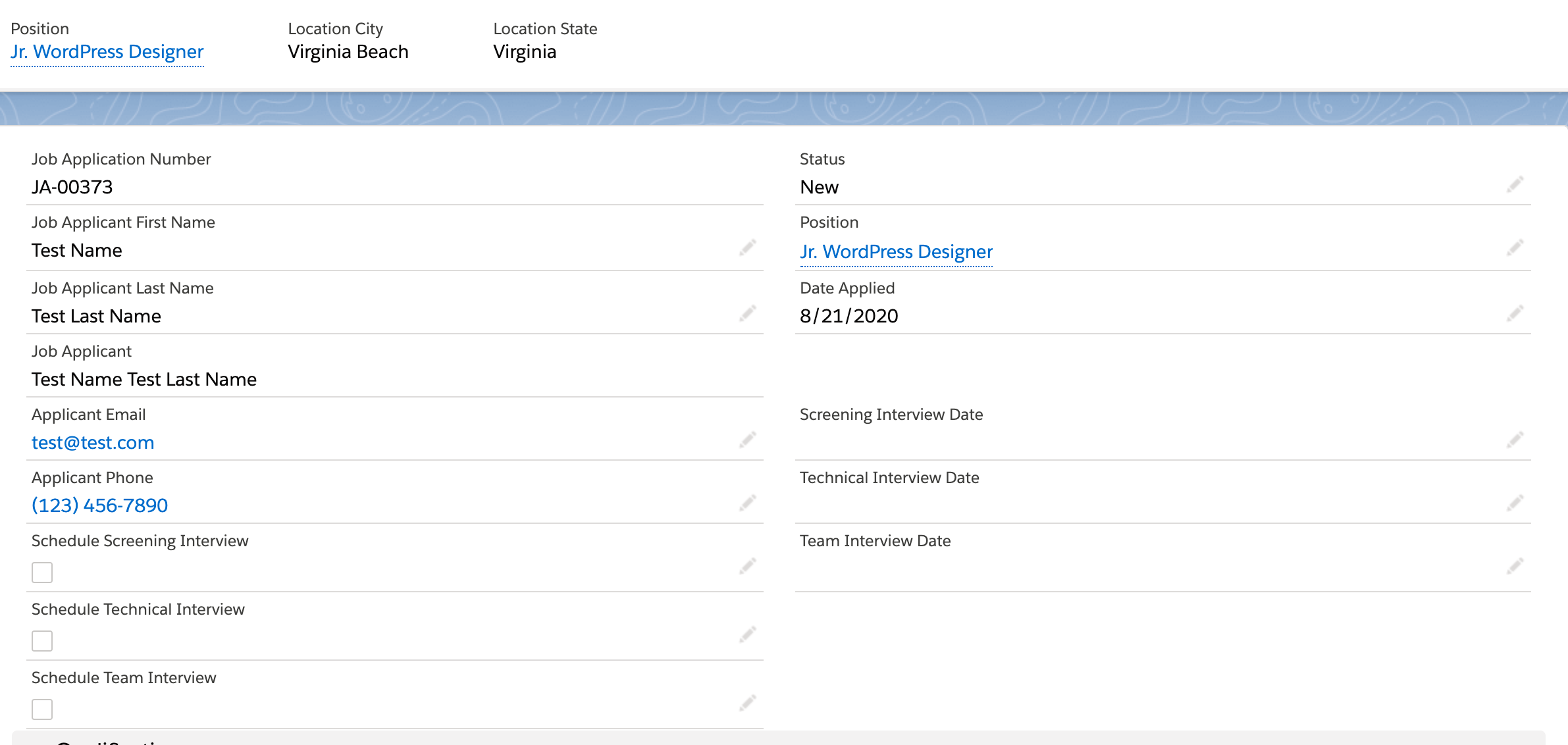 Now that you have your feed setup, it’s time to do a test to make sure all the fields map through correctly! Fill out your form, and then head over to your Salesforce org to see if the lead went through. We filled out a test job application – and it went through!